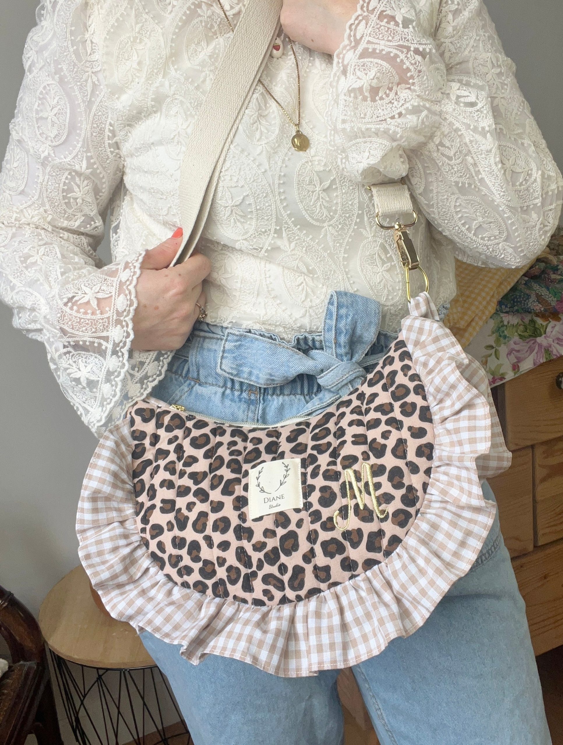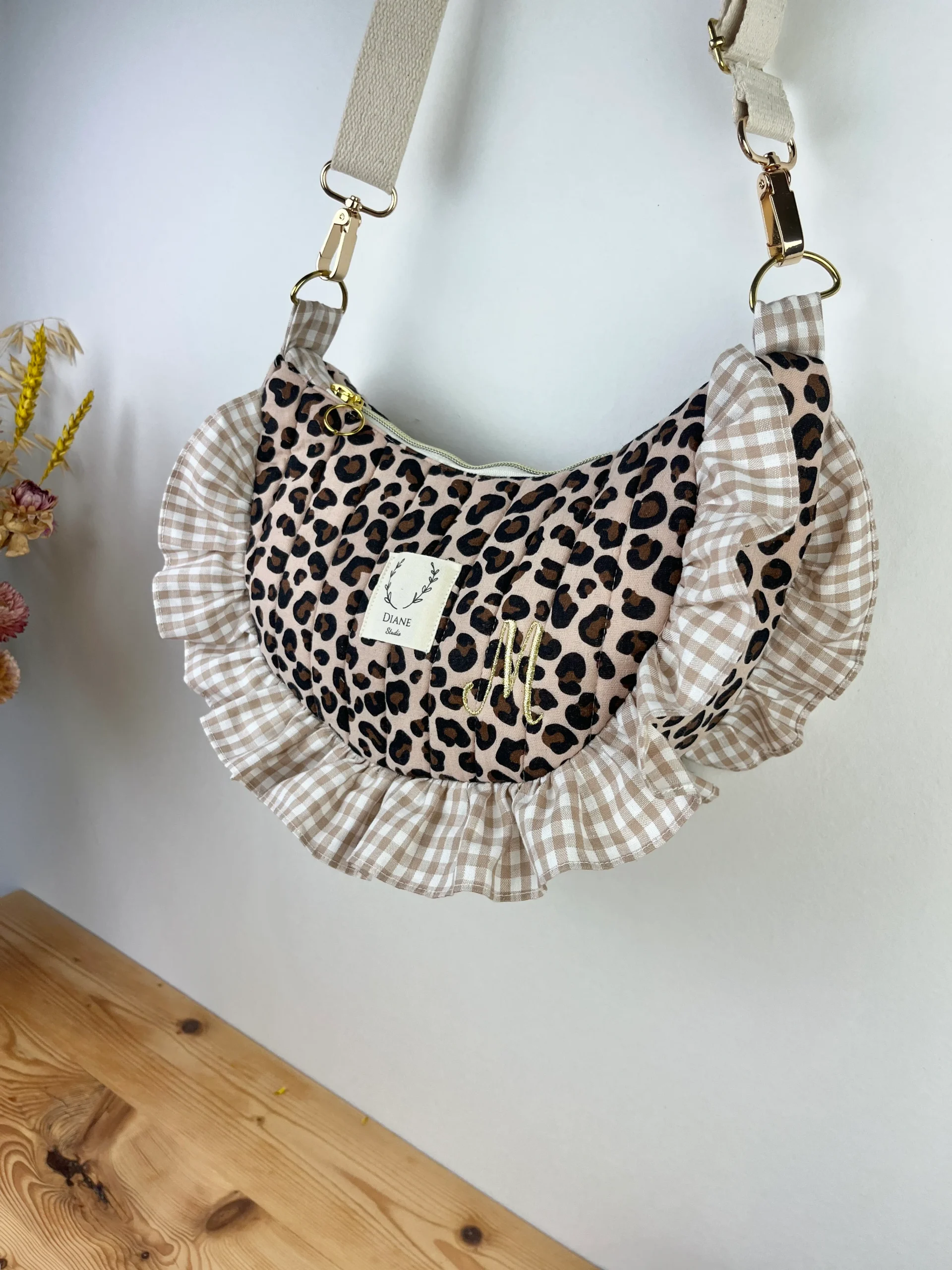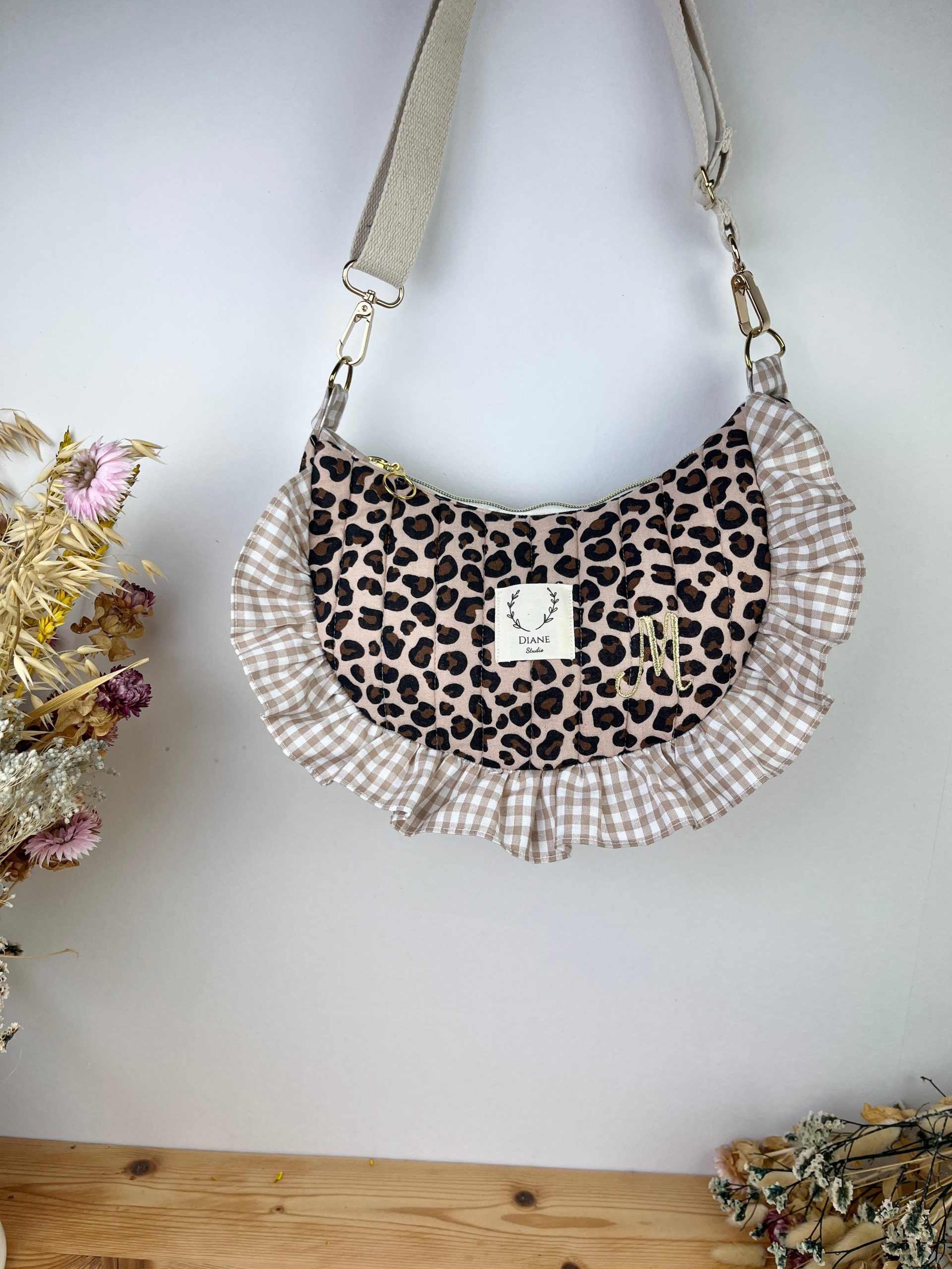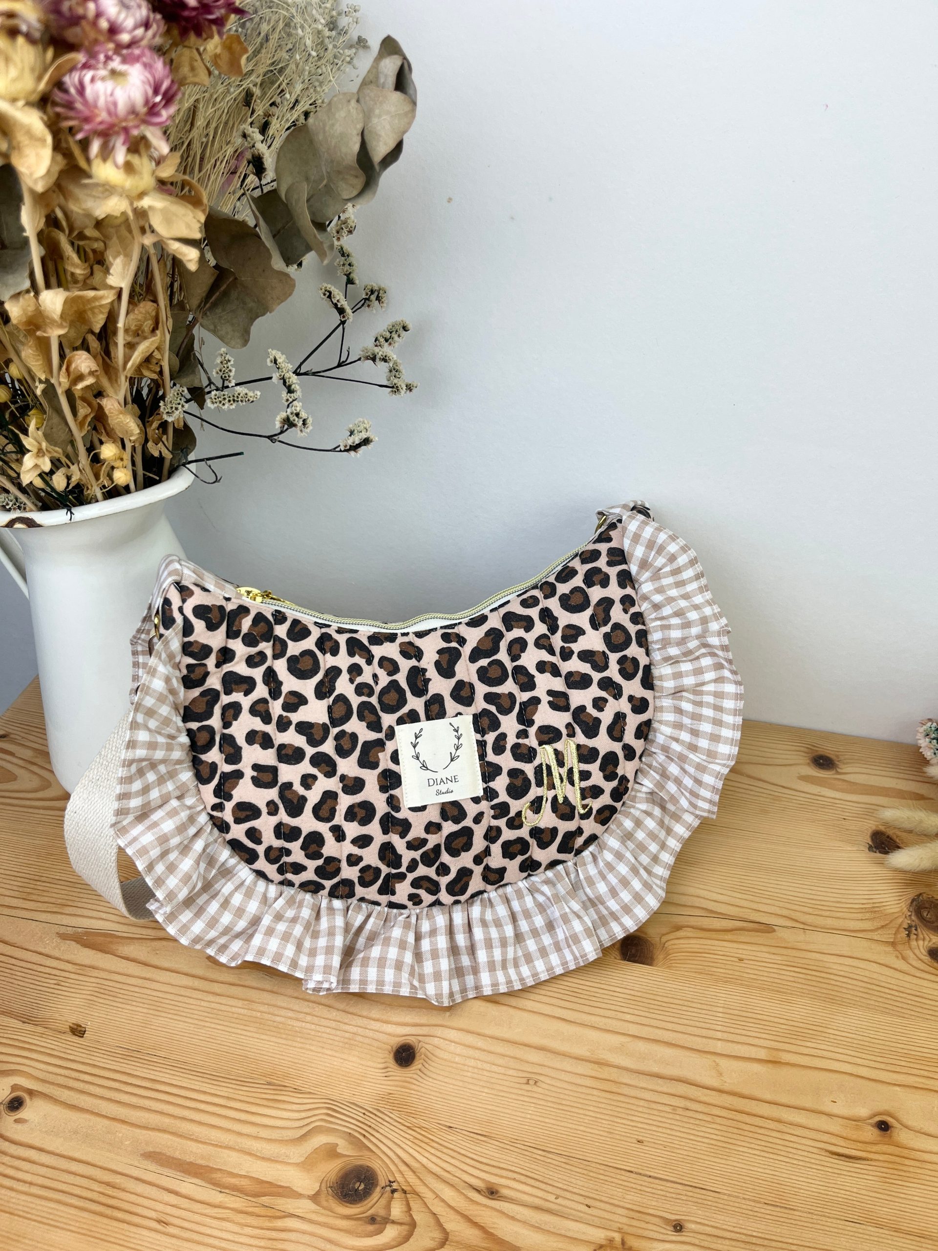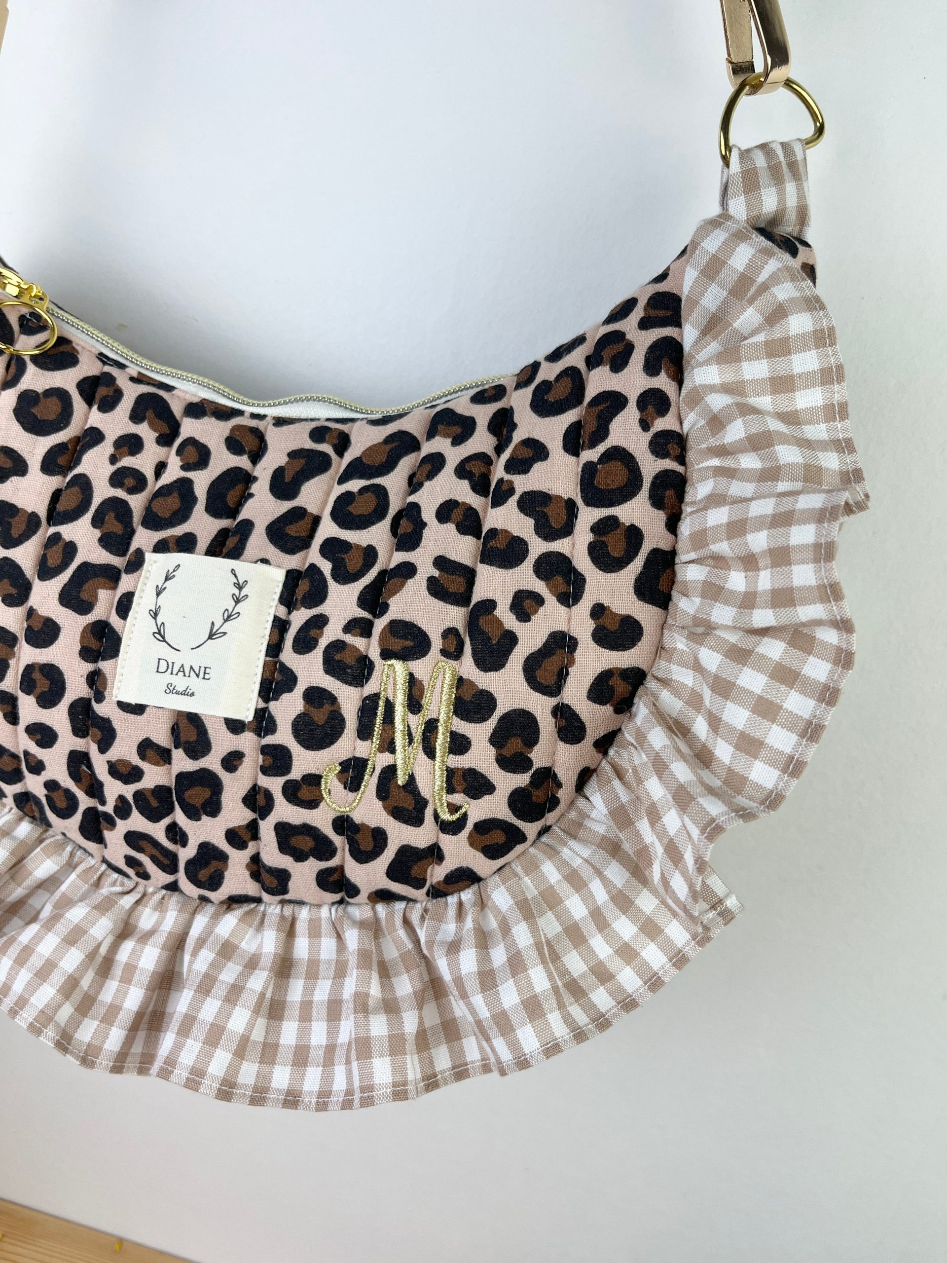 Milan le sac croissant matelassé léopard et vichy beige