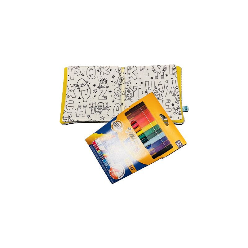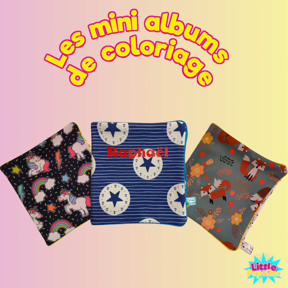 Le mini album de coloriage : Le mini album fait 15×15 cm. Il est fait en Softshell, matière douce et imperméable. Il est composé de deux feuilles de coloriage cousues sur le mini album. Le mini album est personnalisable avec le prénom de l’enfant fait avec du flex thermique. Le mini album de coloriage se lave entièrement à la machine à 30 degrés dès que celui-ci est rempli ou que l’on souhaite recommencer. https://www.littlepopeline.ch/wp-content/uploads/2022/07/video-mini-album-coloriage.m4v