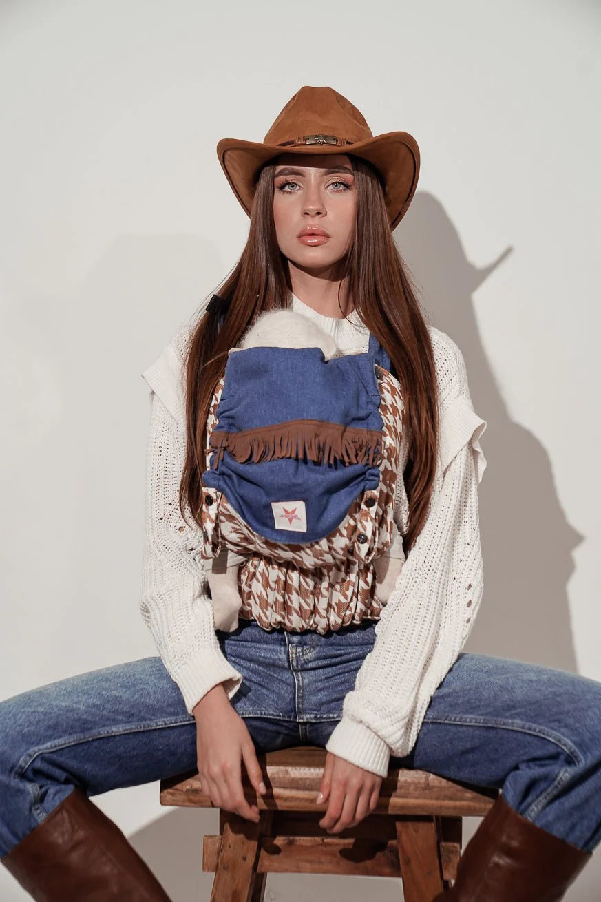 Das markante Houndstooth-Muster in warmen Latte-Macchiato-Tönen trifft auf robusten Jeansstoff – eine Kombination, die das Gefühl von Freiheit, Wild West Spirit und urbanem Chic vereint. Die Mischung aus 55 % Tencel® und 45 % Bambusviskose umhüllt dich und dein Baby mit einer ultraweichen, atmungsaktiven Haptik, die sich sanft anfühlt, aber dennoch stabil und langlebig ist.