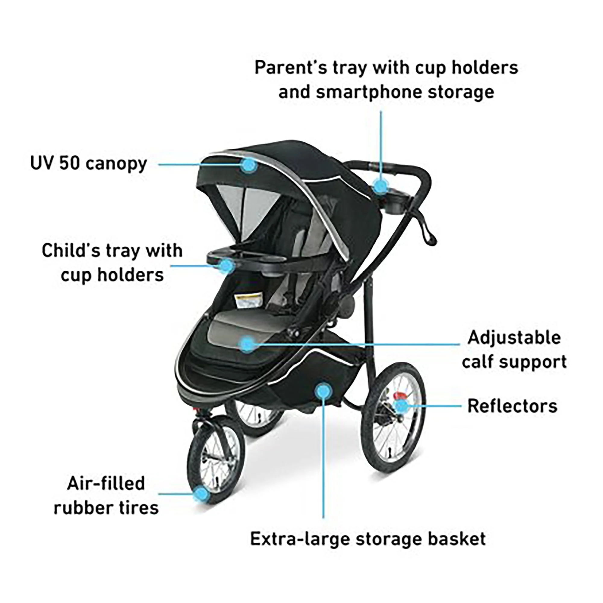 Cette poussette de jogging comprend toutes les caractéristiques de confort et de commodité dont vous avez besoin : pneus en caoutchouc remplis d’air, sangle de sécurité sur la poignée, grand canopy UV50 et vaste espace de rangement. Elle se plie d’une seule main et tient debout une fois pliée : très pratique pour une utilisation à l’extérieur de la maison. Maximisez le confort de votre enfant avec le support réglable pour les mollets, une grande surface pour la nourriture, sans oublier le porte-gobelet !