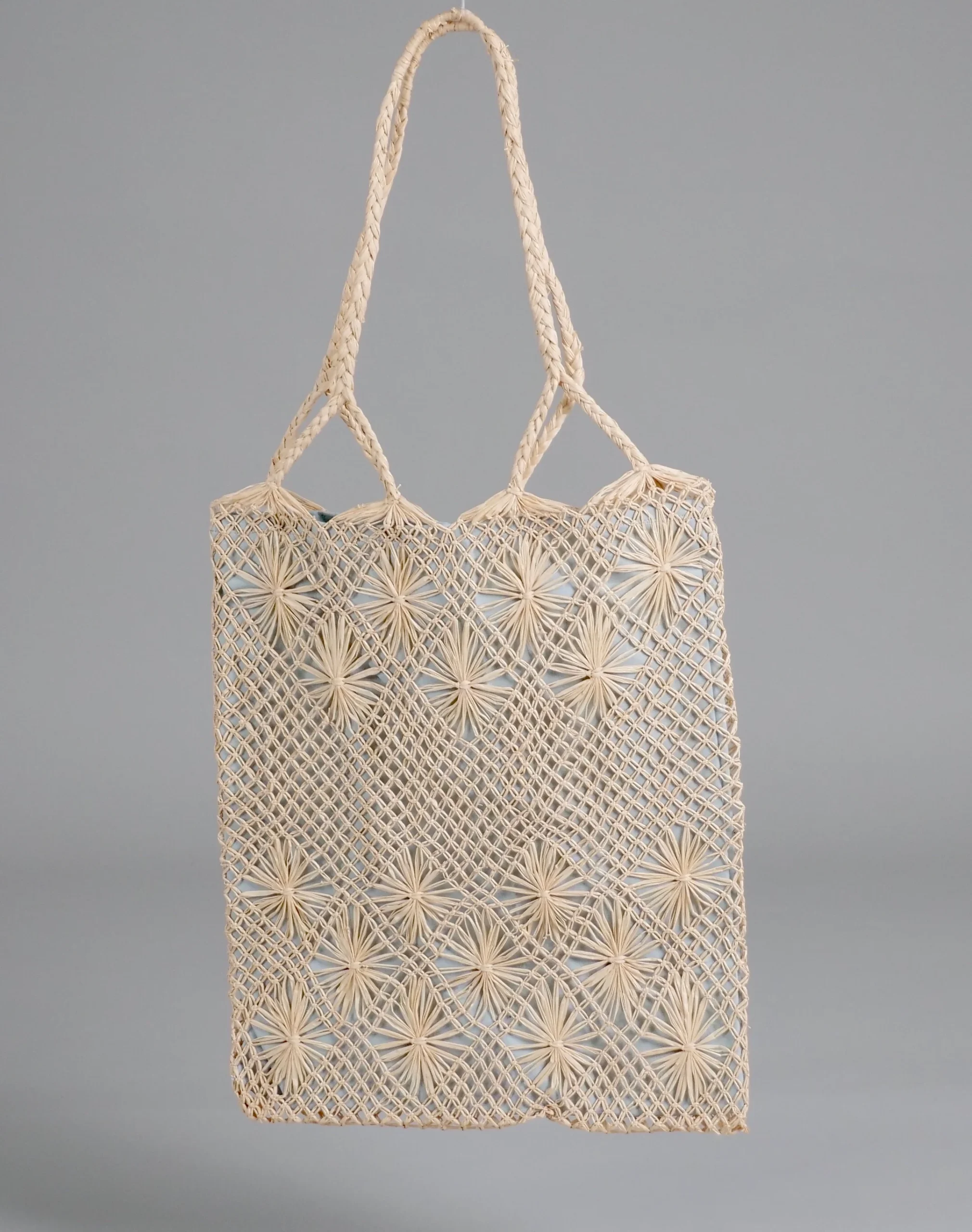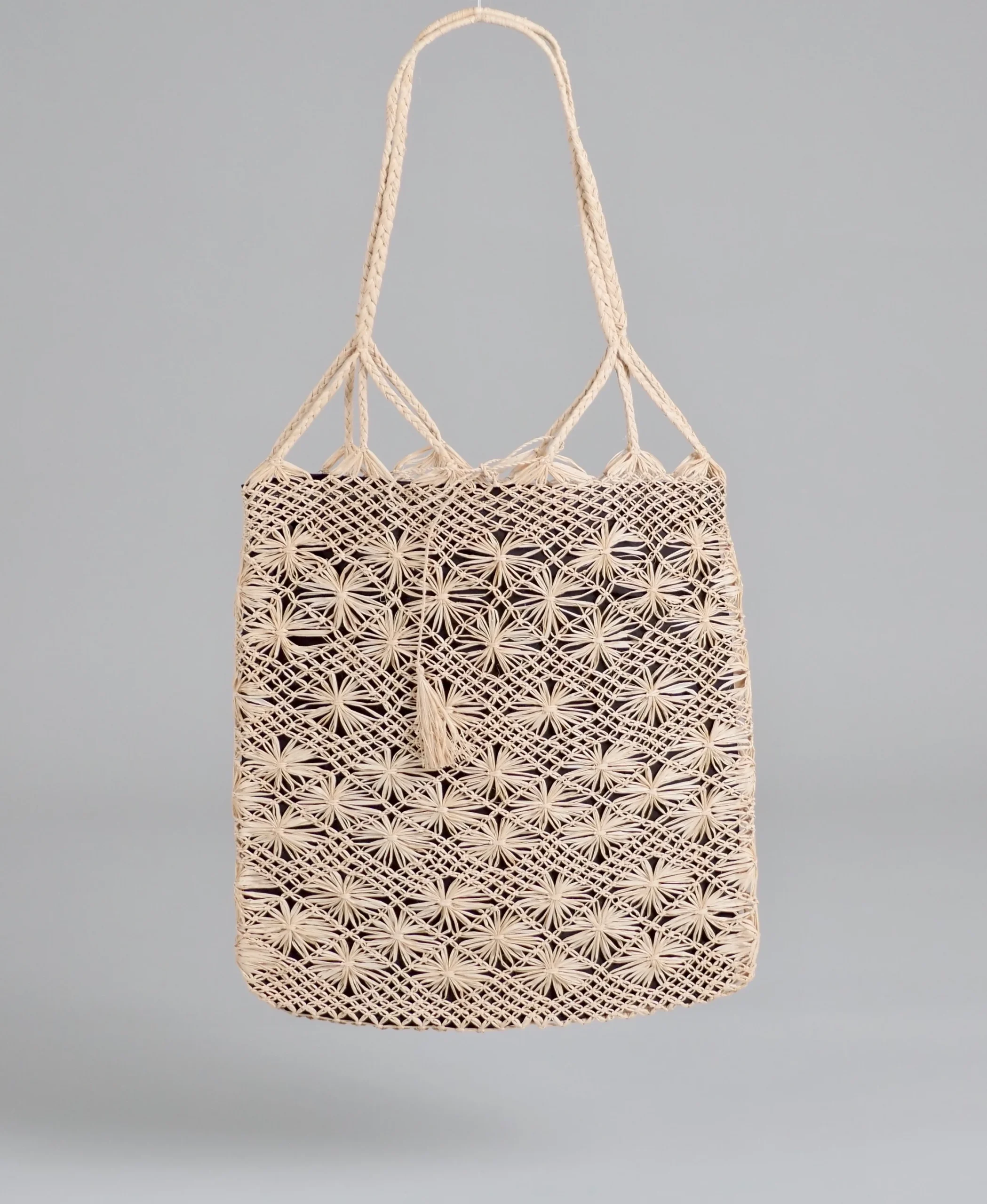 En détail : paille macramé, doublé en coton. Hauteur 35 x 32 cm longer