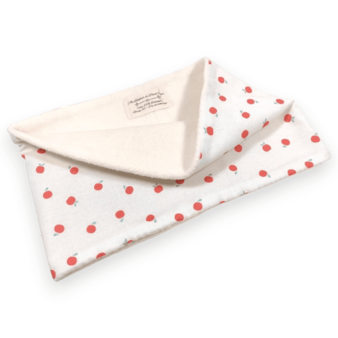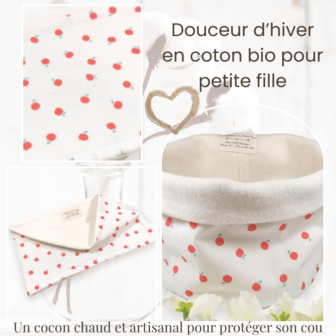Snood fille 5/6 ans en coton bio certifié GOTS, chaud et doux : popeline imprimée “Pomme” et polaire écrue made in atelier. Un accessoire artisanal durable pour les peaux sensibles, idéal en hiver & cadeau écoresponsable.