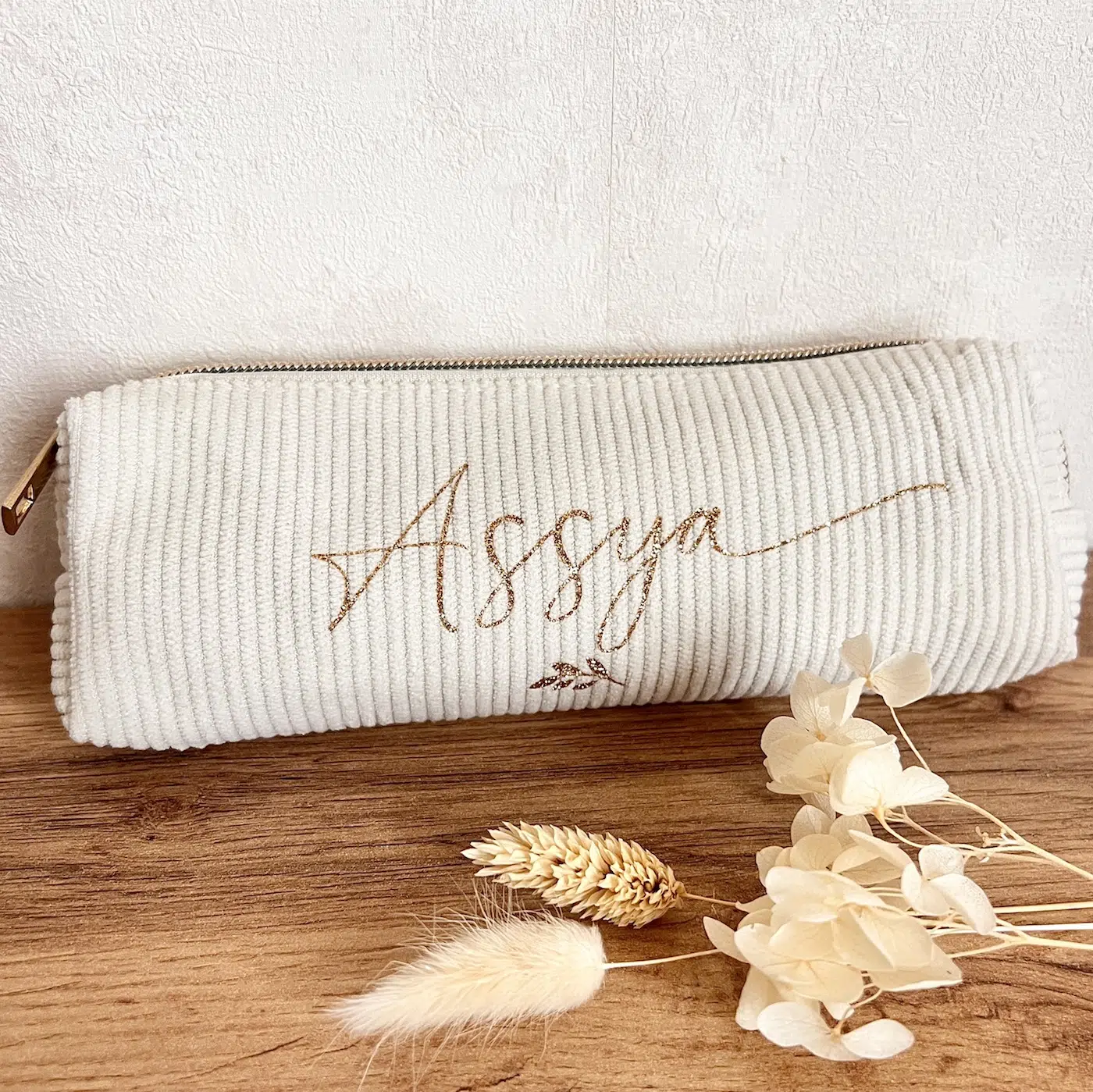 - Jolie trousse personnalisée en velours côtelé. Sa typographie délicate et sa jolie fermeture dorée en font un accessoire précieux et plein de charme.