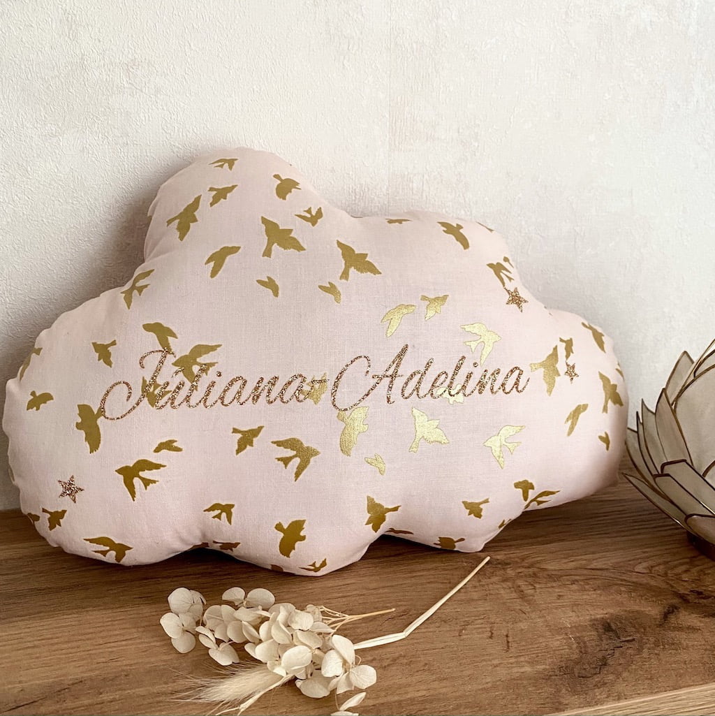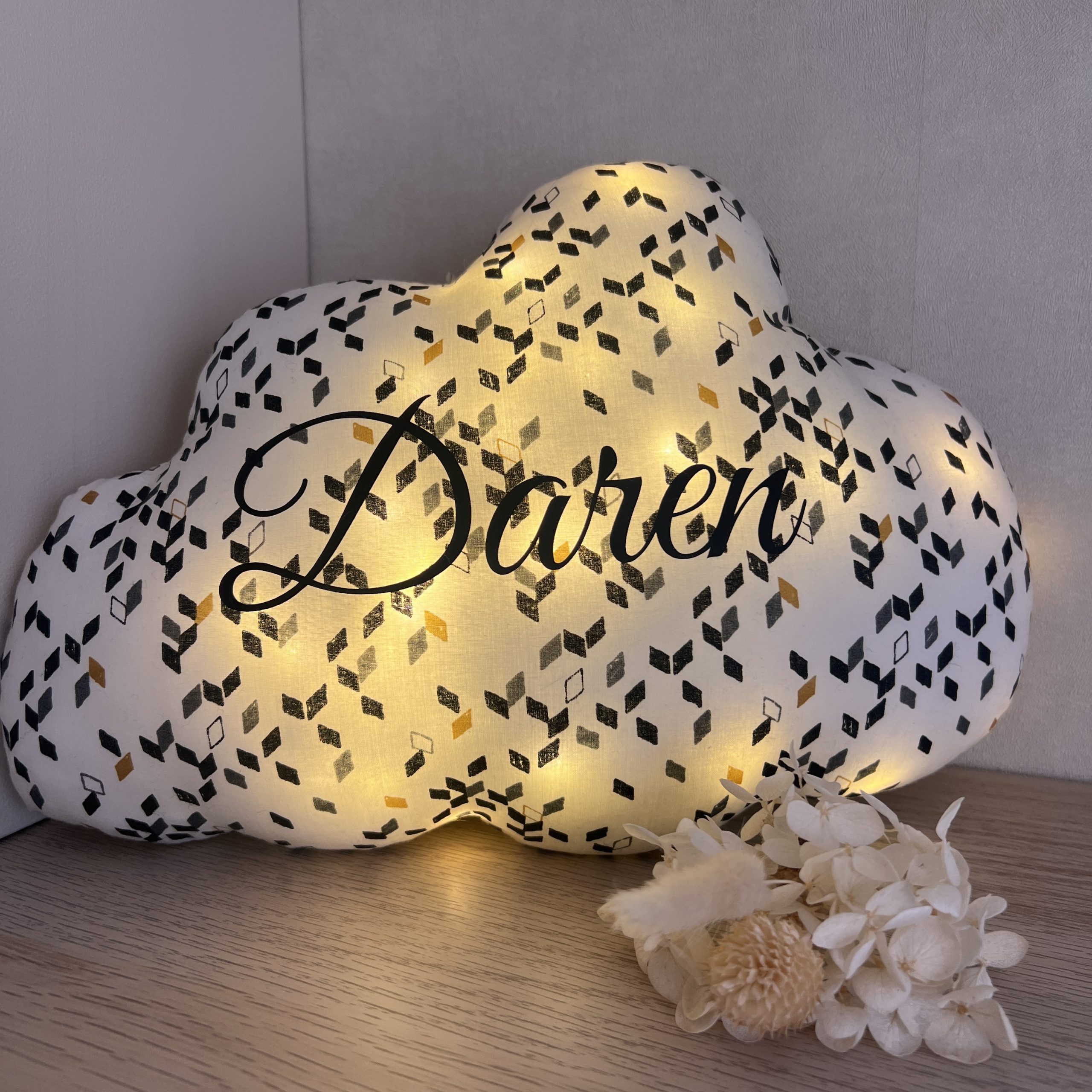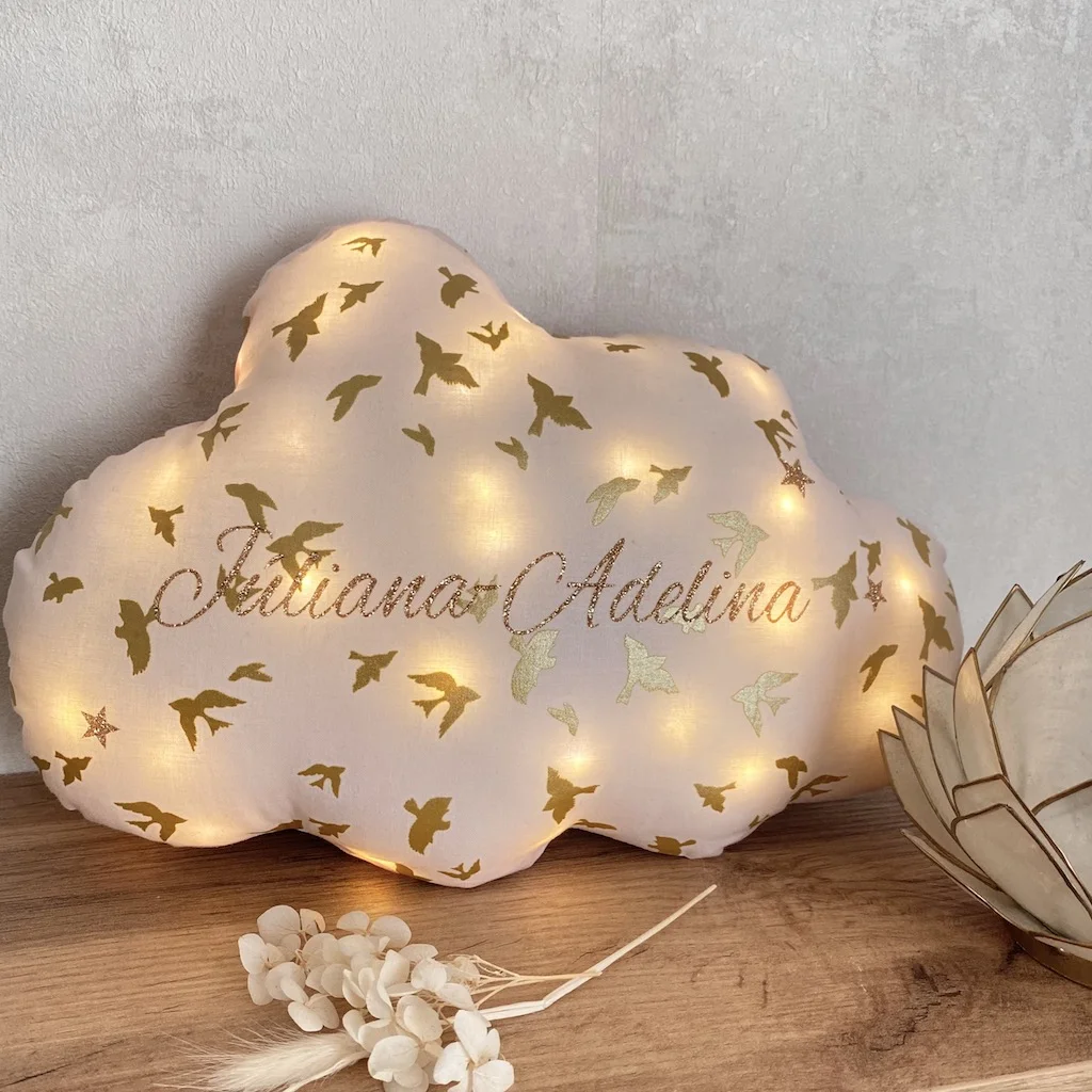 - Jolie veilleuse coussin nuage en coton à motifs au choix pour apporter une touche de poésie dans une chambre d’enfant ou de bébé. A disposer sur un lit ou bien encore un fauteuil pour un ambiance chaleureuse.